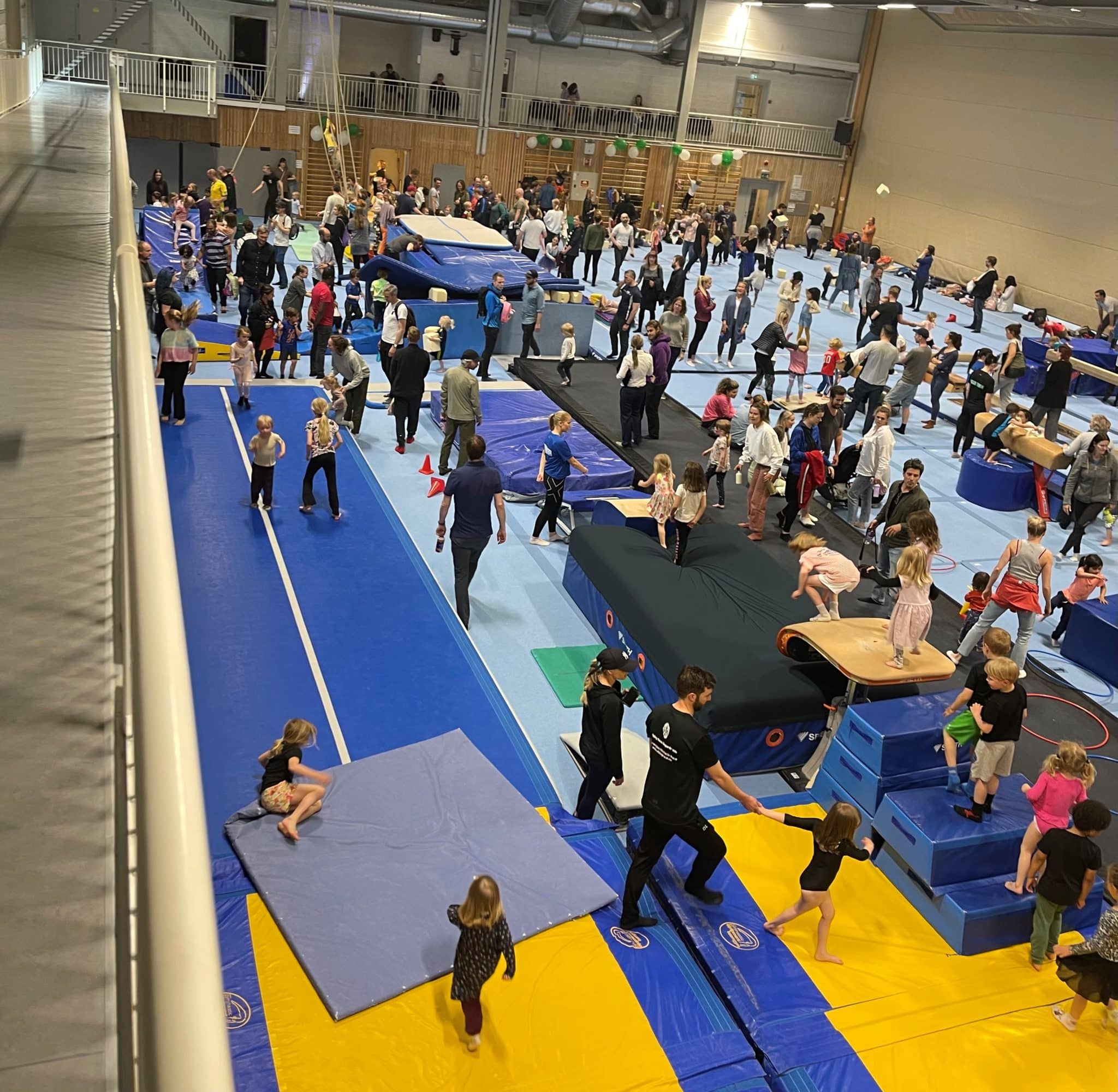 Trenerne holder en liten oppvarming på feltet, før alle gymnaster kan prøve seg på ulike hindre i spennende turnapparater. Motorikksalen oppgraderes til «Klubblek» der man kan danse og leke i discolys. Det blir god stemning og kiosk ved resepsjonsinngangen.